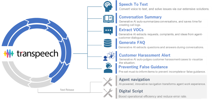 transcosmos hereby announces that as part of its initiative towards enhancing “trans-DX for Support,” the company has fully revamped “transpeech,” its speech recognition solution released in 2018. Centered on its existing features such as speech recognition and conversation summary, the upgraded solution now comes with features that assist contact center agents. Specifically, the solution includes features for 1) extracting VoC, 2) generating FAQs, 3) sending alerts to agents for so-called customer harassment—customers harassing front-line workers with aggressive behavior or unreasonable requests, and 4) checking if all necessary information is provided to customers, etc. Applying AI technology to all these features, the new AI-powered solution is designed to assist contact center agents more actively, thereby enabling agents to operate and serve customers in more advanced ways.
